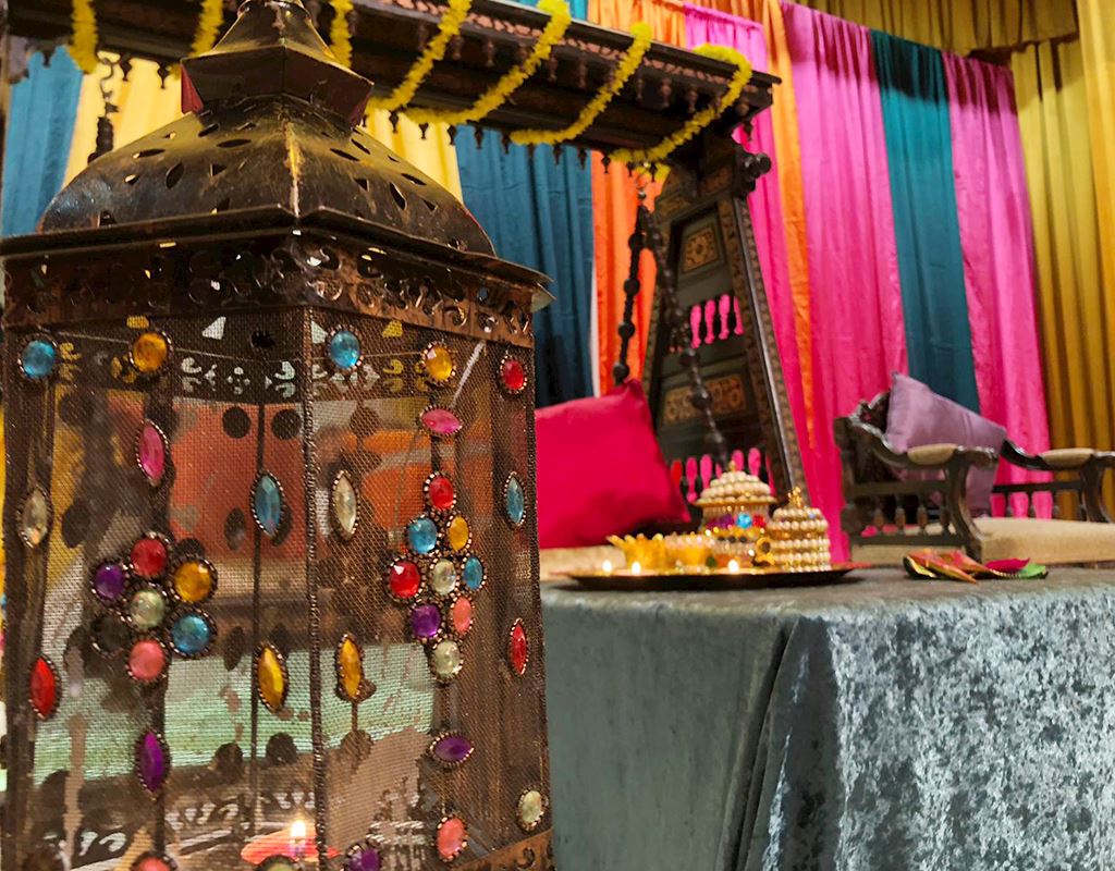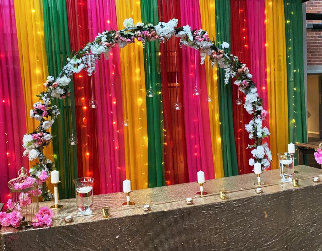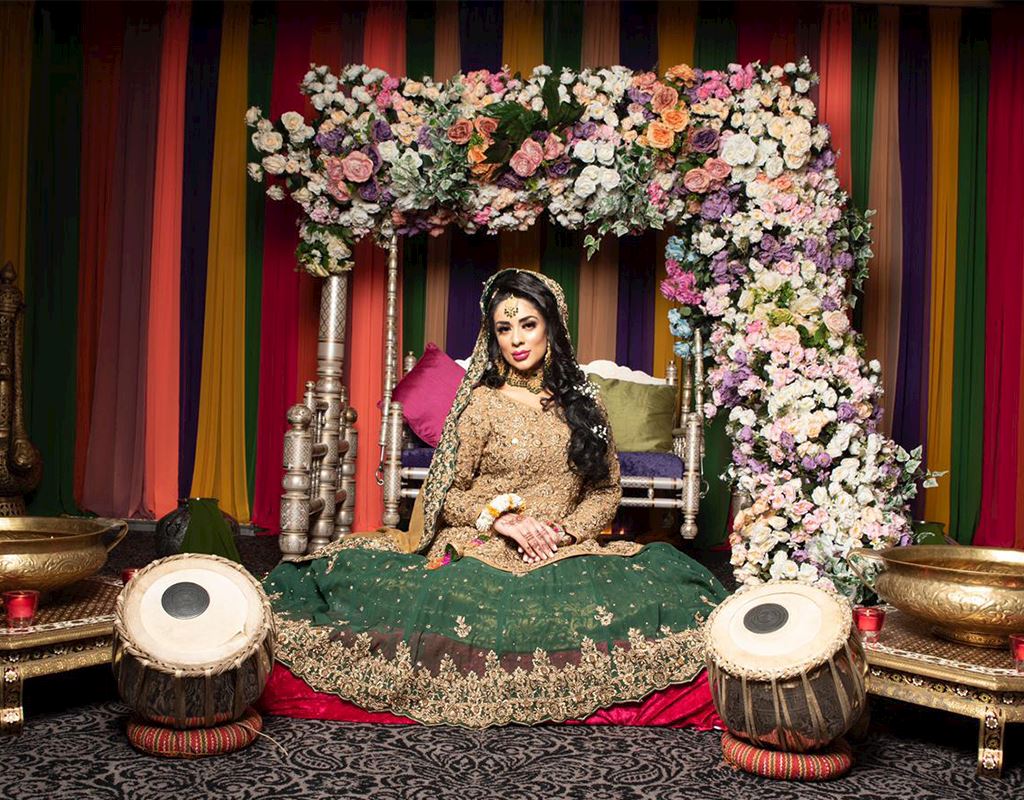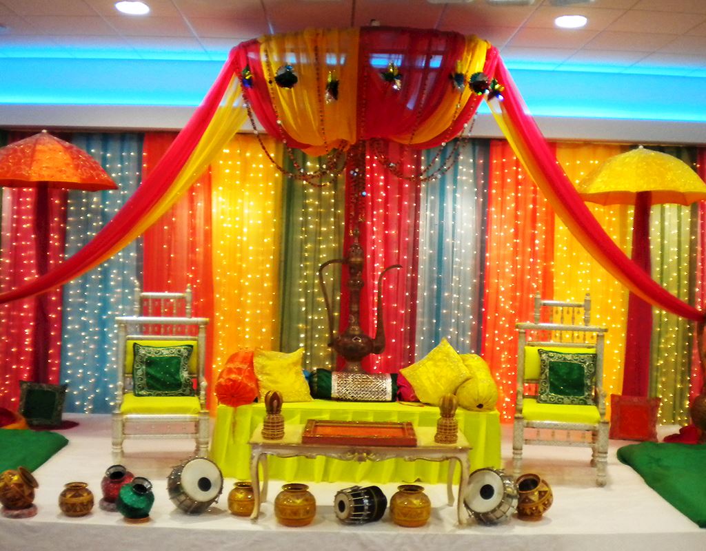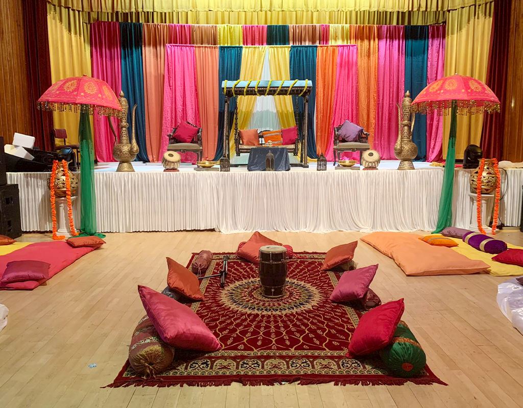 Bombay Events offer a traditional range of Mehndi décor and staging options including the classic orange, pink and green multi-coloured stage with satin/silk back drop curtains.