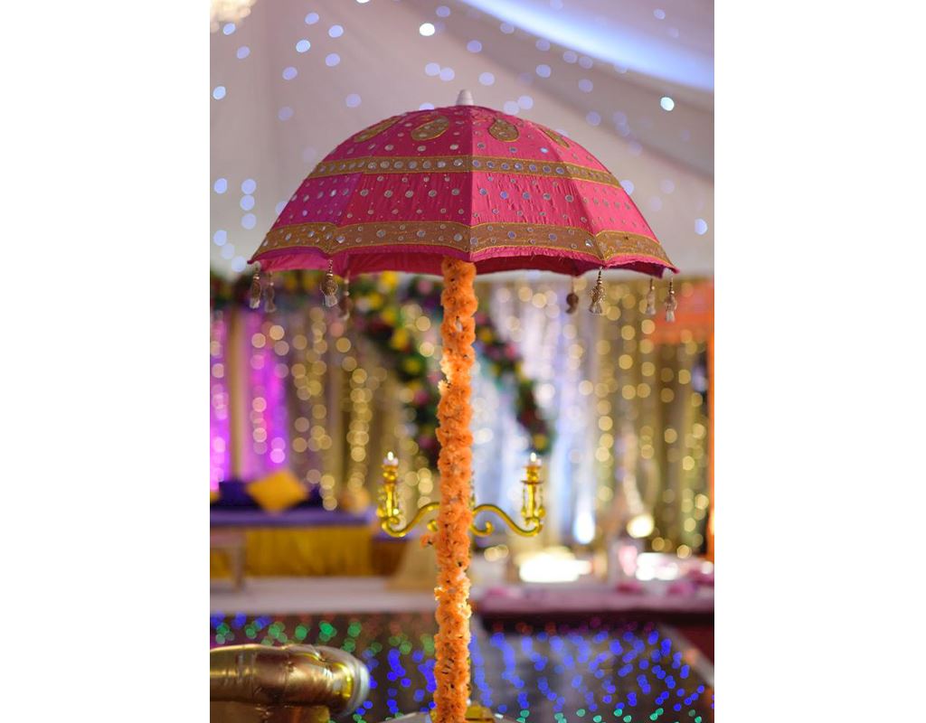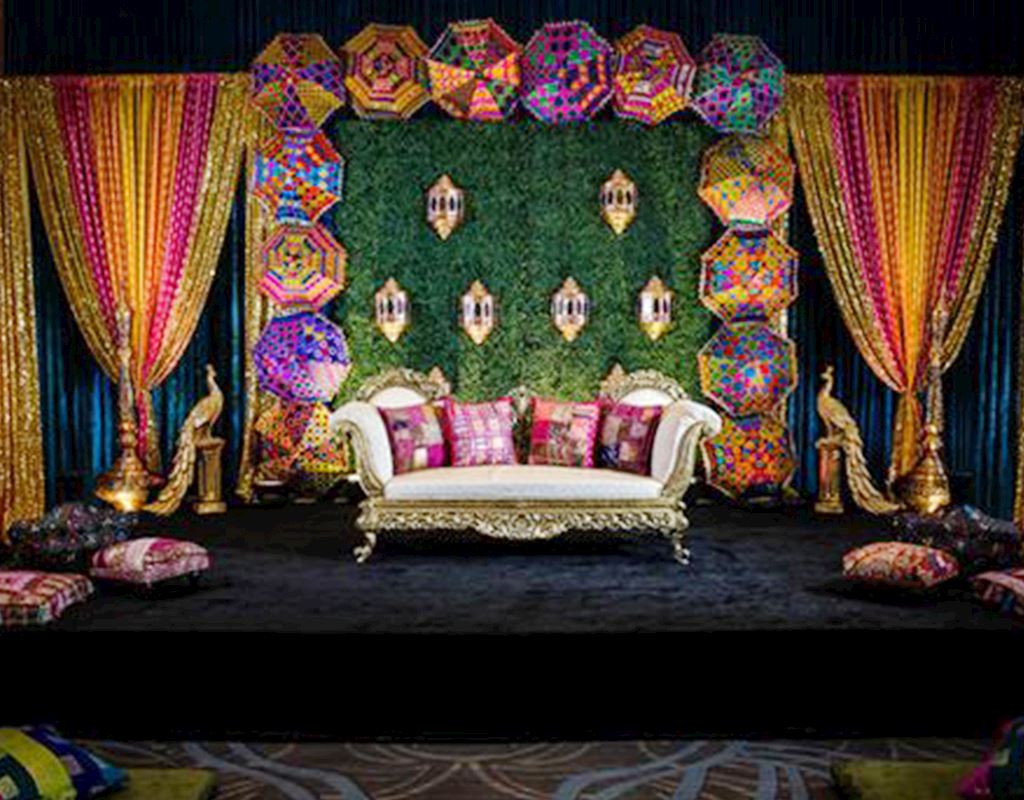 jhoola/swing, mattresses, cushions, Rajasthani umbrellas, fairy lights, lamps and lanterns to accompany the stage.